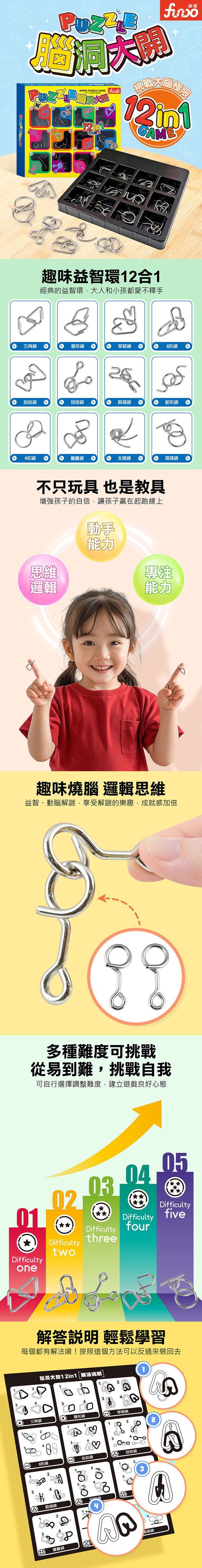 ★本產品內含12款不同難度、不同等級的益智環,從1顆星到5顆星,可以循序漸進完成挑戰,在遊戲過程中鍛鍊大腦邏輯思維,結合趣味性與挑戰性,讓孩子享受解謎樂趣,激發專注力!