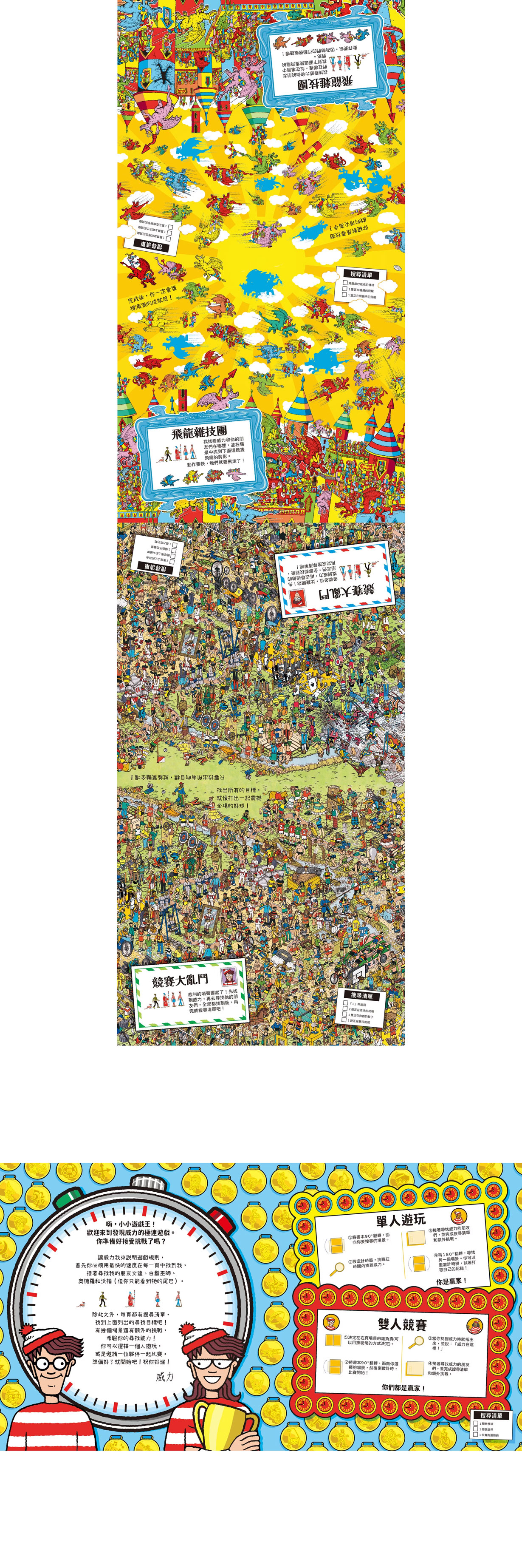 ★本書透過層層關卡與找威力遊戲,引導讀者在琳瑯滿目、細節豐富的畫面中尋找目標物,過程中自然訓練專注力,同時激發讀者的記憶力與觀察力,寓教於樂。 不只孩子,大人也常常一玩就上癮,成為親子共讀、親子共玩的最佳選擇!