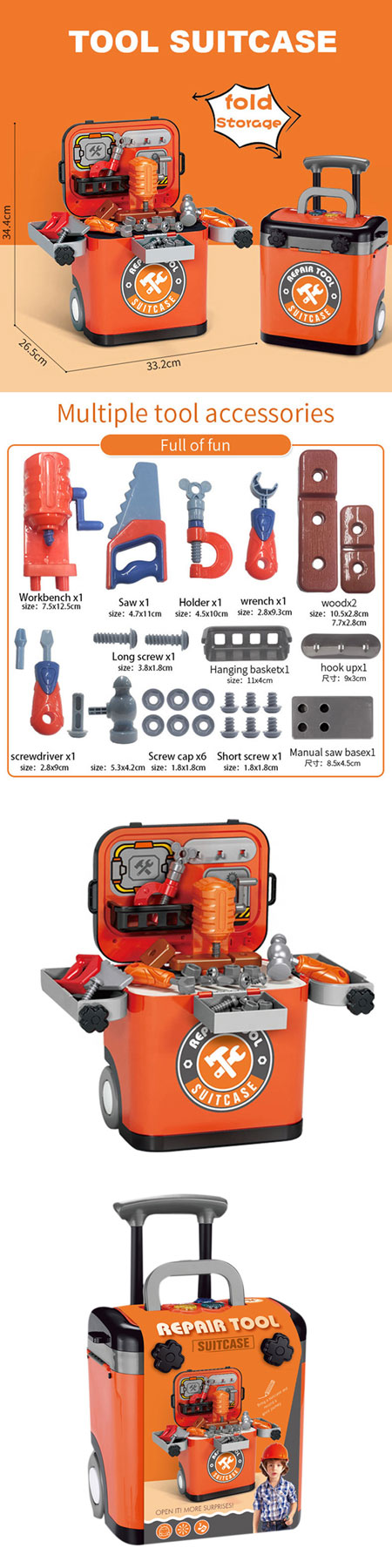 工具套裝包括:扳手、手鉗、鐵鎚、螺絲、螺帽等。 這個工具組有很多配件,讓你的孩子忙碌幾個小時的樂趣。