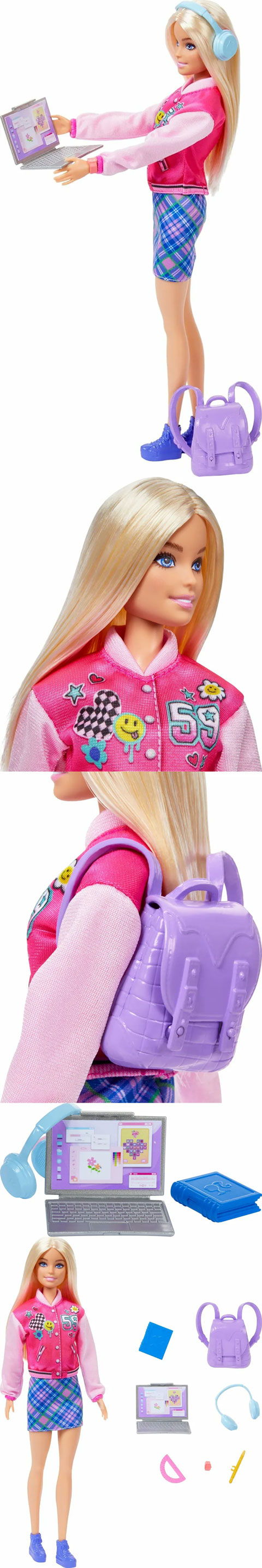 ★芭比娃娃已準備好以酷炫的學校外觀上課。孩子們可以在真正打開的背包內存放較小的物品,例如鉛筆、筆記本和量角器。其他物品包括筆記型電腦和耳機。娃娃穿著格子裙和粉紅色夾克,帶有時尚的補丁細節