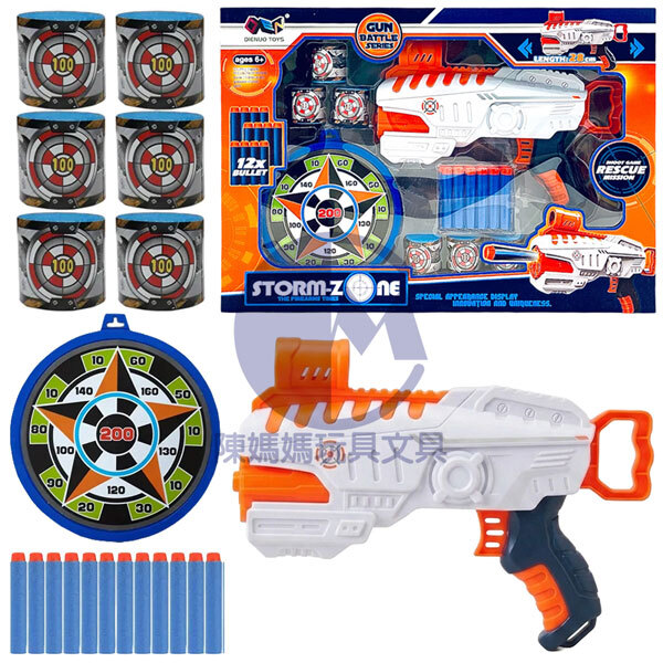 ★包含1隻軟彈槍、1個標靶、12發EVA 海綿軟彈以及6個射擊靶罐