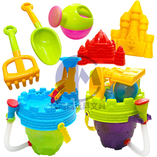 ★內容物:沙灘桶*1、水車*1、沙漏網1、挖鏟*2、模具*2、花灑*1