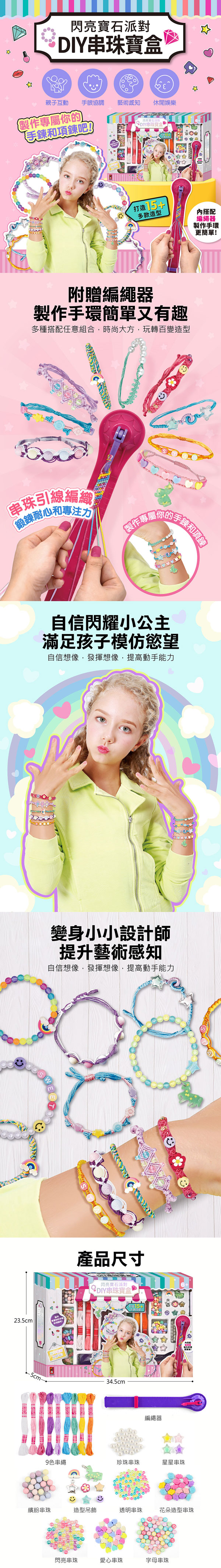★內容物:造型吊飾、字母串珠、愛心串珠、珍珠串珠、星星串珠、編繩器X1、8色串繩、透明串珠、花朵造型串珠、閃亮串珠、繽紛串珠