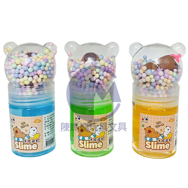 ★史萊姆顏色透亮,採用新穎小熊造型的雙開瓶設計,超可愛,下面是史萊姆,上面是馬卡龍顏色的保利龍球和隨機款公仔一隻